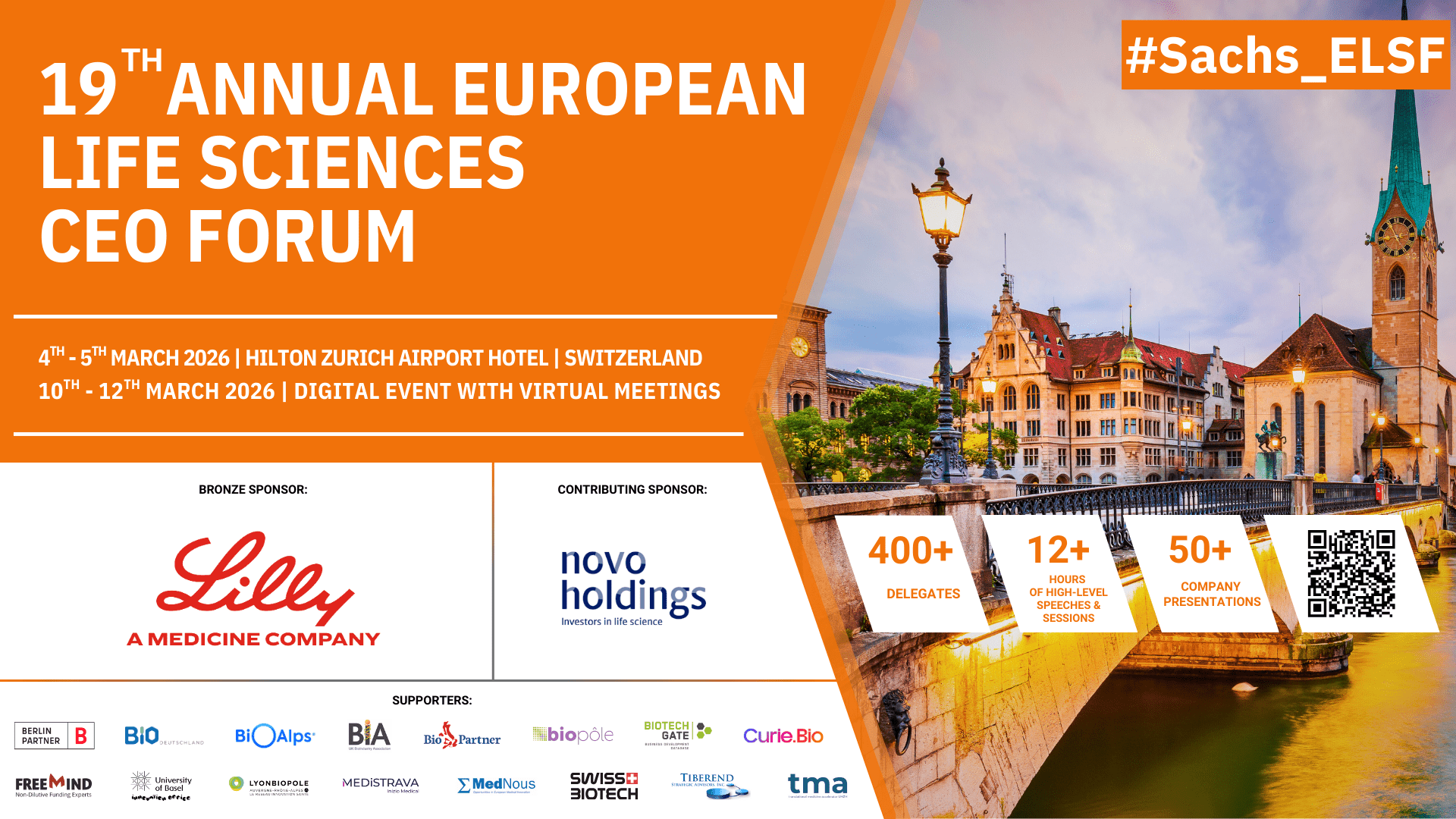 We are pleased to announce that the 19th Annual European Life Sciences CEO Forum (#Sachs_ELSF) will take place on the 4th - 5th of March 2026 at the Hilton Zurich Airport Hotel. The event will be part of the Sachs Spring Life Sciences Week (#SSLSW), which will also incorporate the 1st Annual European Neuroscience Innovation Forum (#Sachs_ENIF). It will be held on the 3rd of March 2026, the day before ELSF, allowing relevant attendees to register for both events.