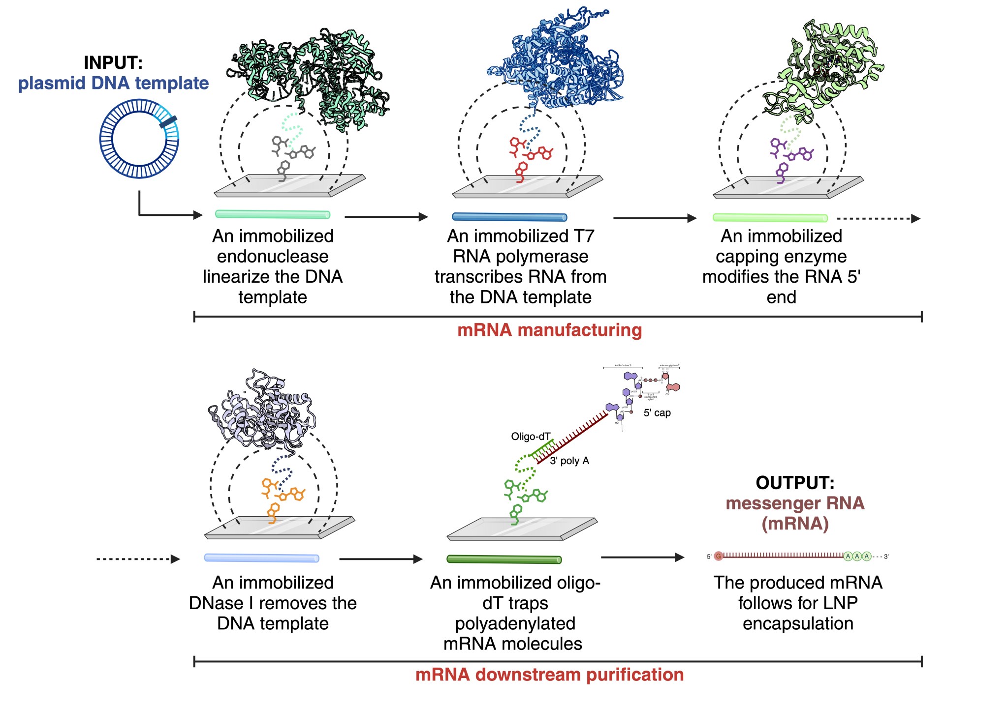 INOFEA has developed tailor-made enzymes for high value therapeutic production processes such as manufacturing mRNA vaccines. By immobilizing enzymes on carriers, the enzymes can be reused in continuous manufacturing, which reduces costs and waste. Immobilized enzyme processes can produce two to three times more mRNA than soluble enzyme processes using the same amount of template and units of enzyme. During the Covid pandemic, one dose of vaccine cost around USD 10 but the cost has now been reduced to around USD 2 per unit. The technology can also be used in downstream purification steps which contribute to more than half of total costs of goods today.