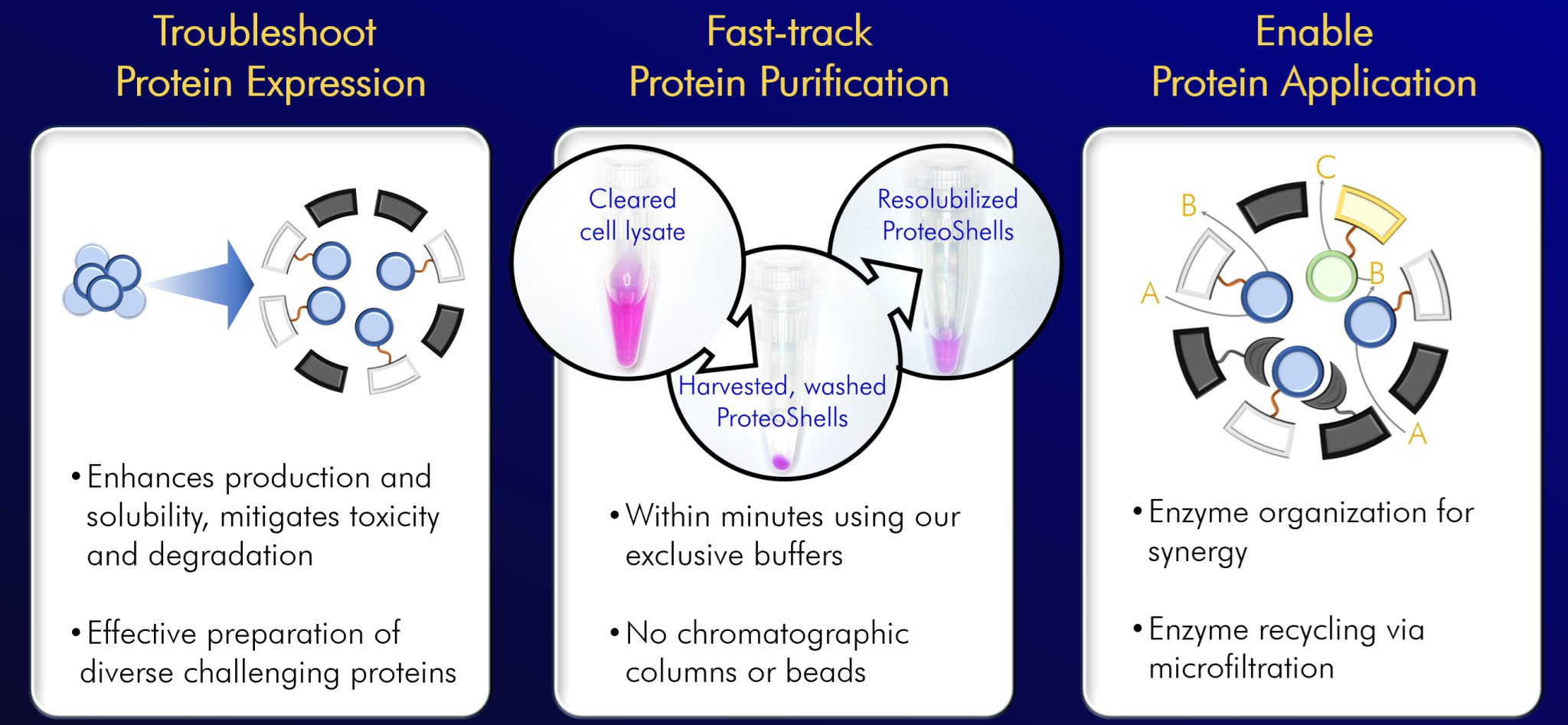 Lock and Key Biosciences fast-tracks challenging protein expression. Bacterial cells excel as factories of recombinant proteins but lack specific mechanisms to store and protect such exogenous materials; their protein production is often limited by aggregation, misfolding, degradation, and toxicity towards the host cells. Lock and Key’s ProteoShell System expedites protein production in E. coli by enclosing recombinant proteins in protective storage compartments during the expression process. ProteoShell-protected proteins offer further advantages for down-stream processing, including a buffer-based purification procedure, and enhanced stability, cooperation, and separation of enzymes in biocatalytic applications.